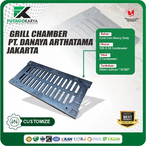 Salah satu produk unggulan kami adalah grill penutup selokan untuk kawasan SCBD Jakarta yang dirancang khusus untuk memenuhi standar kualitas tertinggi dan kebutuhan fungsionalitas di area perkotaan yang padat. Produk ini tidak hanya berfungsi sebagai penutup selokan, tetapi juga memiliki kekuatan dan daya tahan tinggi karena dibuat dari bahan Cast Iron Heavy Duty (FCD).