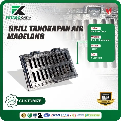 Grill Tangkapan Air Magelang dari Futago Karya adalah pilihan terbaik untuk solusi drainase yang efisien dan tahan lama. Dengan spesifikasi unggulan seperti bahan Medium Duty, lapisan cat tiga lapis, dan desain yang fungsional, produk ini menawarkan performa yang luar biasa untuk kebutuhan drainase di berbagai area.