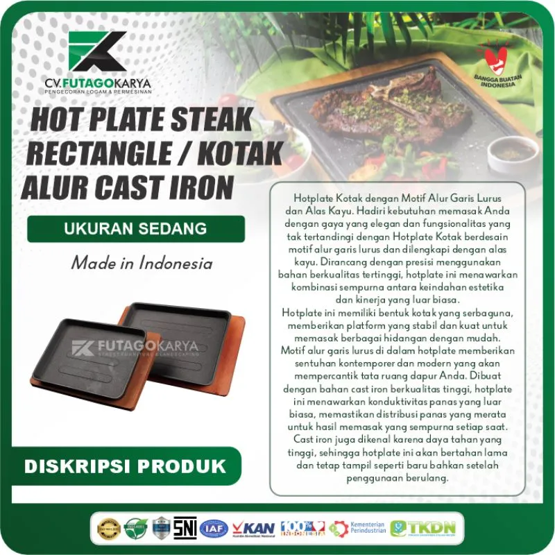 Untuk memberikan gambaran yang lebih jelas, berikut adalah tabel spesifikasi lengkap dari produk Hot Plate Steak Kotak Futago Karya yang banyak digunakan oleh restoran dan hotel di berbagai daerah: