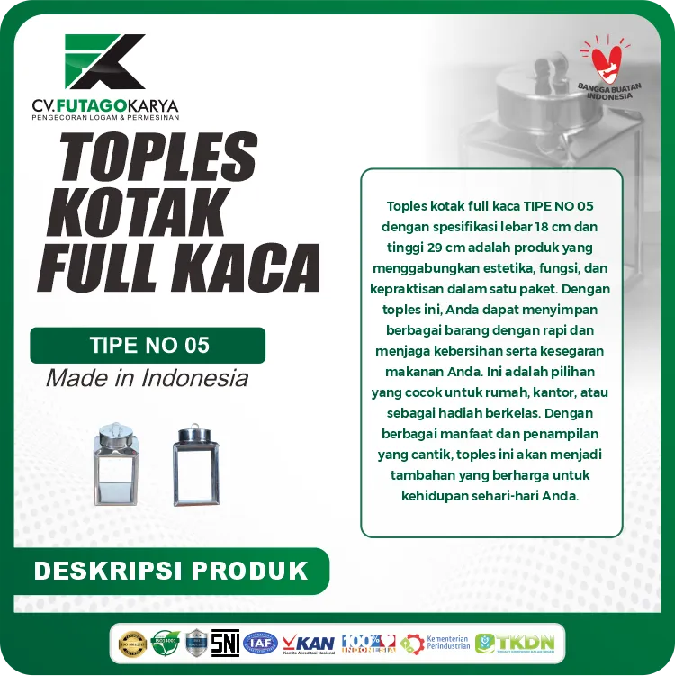 Memilih produk dari Futago Karya berarti Anda mendapatkan lebih dari sekadar wadah penyimpanan. Kami adalah produsen langsung yang berkomitmen memberikan kualitas terbaik melalui kontrol penuh pada proses produksi. Setiap Toples Kotak Kaca dibuat dengan teliti oleh tenaga ahli berpengalaman, sehingga hasil akhirnya benar-benar memuaskan.
